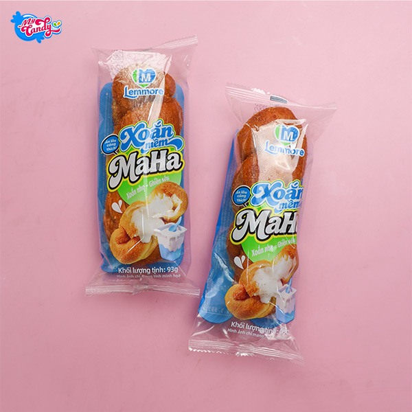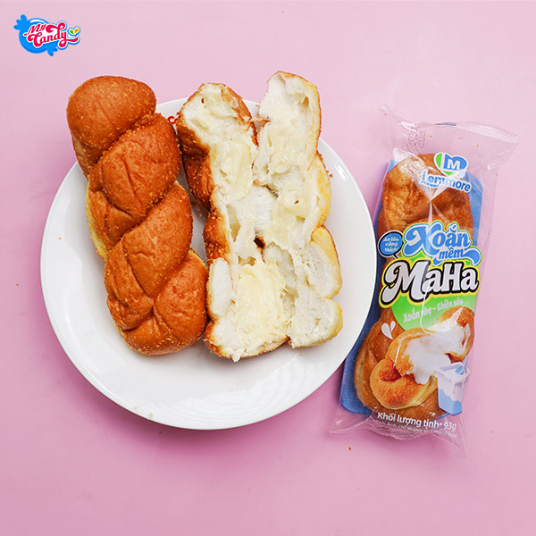 Bánh mỳ xoắn mềm Maha vị sữa chua mềm xốp, vỏ vàng thơm, nhân sữa chua béo dịu chua nhẹ, ăn không ngán, thích hợp làm bữa xế hoặc ăn vặt tiện lợi.
