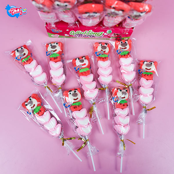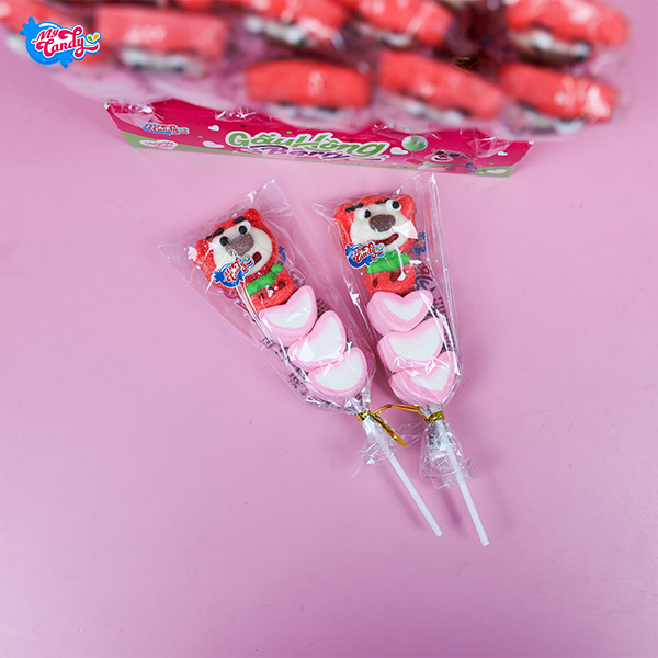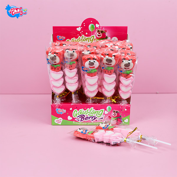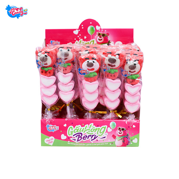 Kẹo bông gấu hồng berry có tạo hình chú gấu màu nâu, bụng tròn, nhìn rất dễ thương. Kẹo làm bằng bông gòn nên cầm lên nhẹ, mềm và không bị cứng. Khi ăn, kẹo có vị dâu rõ ràng, ngọt nhẹ, mùi thơm không quá gắt. Kết cấu kẹo dẻo mềm, nhai vào thấy mịn, không bị cứng hay bở.