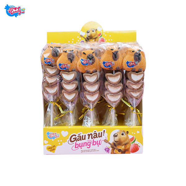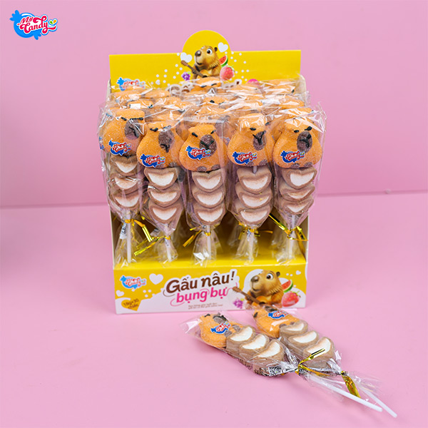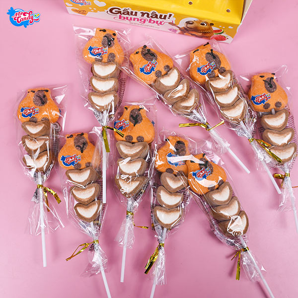 Kẹo bông gấu nâu bụng bự có tạo hình chú gấu màu nâu, bụng tròn, nhìn rất dễ thương. Kẹo làm bằng bông gòn nên cầm lên nhẹ, mềm và không bị cứng.