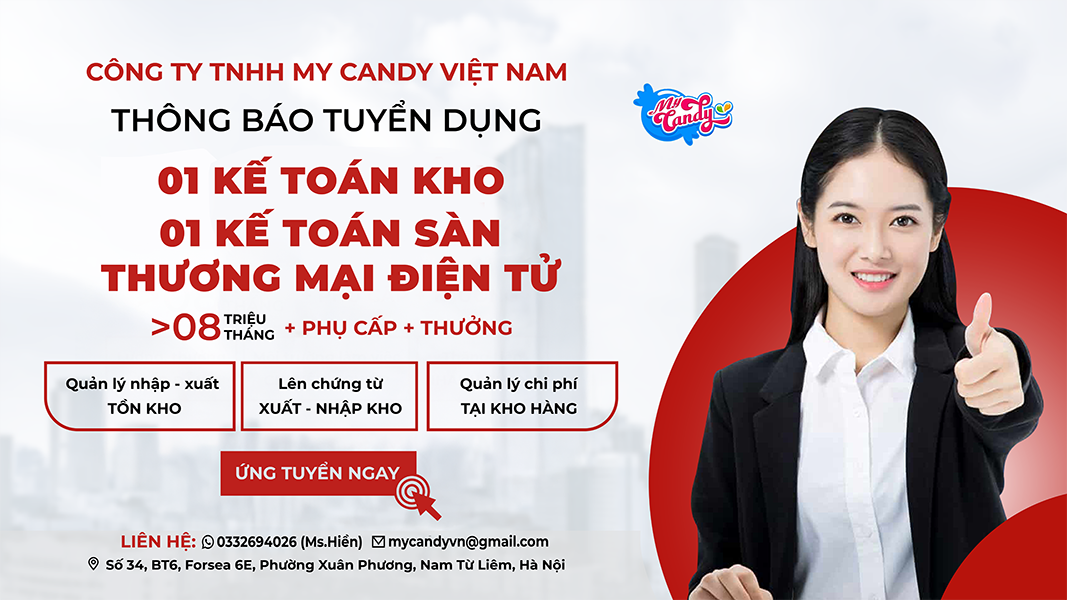 Công ty TNHH My Candy Việt Nam tuyển dụng 01 vị trí nhân viên kế toán sàn thương mại điện tử, 01 nhân viên kế toán kho đi làm ngay